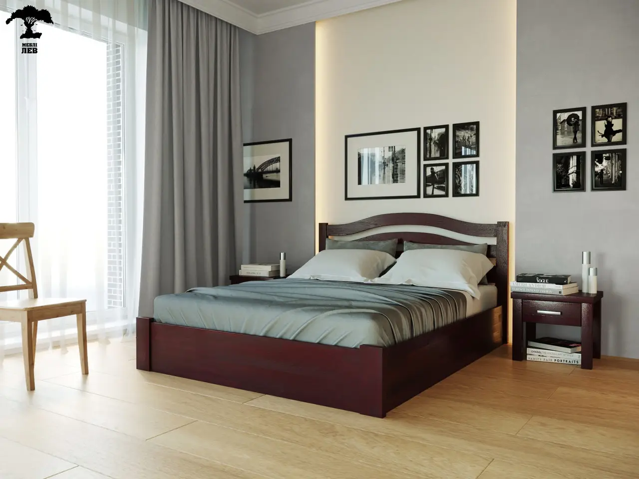 Розмір спального місця Довжина: 200 см; Ширина: 90, 120, 140, 160, 180 см Габаритні розміри: Довжина: 208,5 см Ширина: +8 см до ширини спального місця Висота стійки від голови: 69 см Висота стійки від ніг: 36,5 см Порода деревини: сосна, бук Покриття: гіпоалергенний лак італійського виробництва Основа під матрац: ортопедичні ламелі товщиною 8 мм