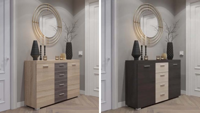 Напрямні на шухлядах телескопічні, корпус виконаний в оригінальному декорі «вудкон», що імітує бетон нейтрального світло-сірого відтінка. Фасади виконані з ЛДСП, у теплому декорі «дуб гранж пісочний», що передає м’якість деревини. Металеві ручки в чорному кольорі практичні та підкреслюють лаконічність. Завдяки широкому асортименту модулів, система Bari задовольнить потреби більшості  житлових зон. Корпус і фасади виготовлено з […]
