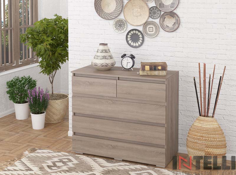 Габаритні розміри Висота: 110,4 см. Ширина: 100 см. Глибина: 50 см. Матеріали Деталі: Каркас комода і шухляд – ламіноване ДСП, фасад шухляд та стільниця – шпон МДФ. Дно шухляди : ДВП. Направляючі механізми: телескопічні повного висуву Кольори: Венге | Горіх | Лак | Махонь | Вільха