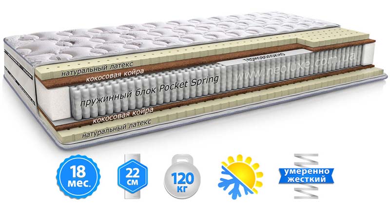 Тип Пружинні Жорсткість 3 4 Наповнювач Softex Бавовна Softex Вовна Thermofelt Захисне полотно Spand Guard Латексована бавовна Вид Pocket Spring Вид жорсткості Середня/Жорстка ОсобливостіОсобливості Двосторонній З єврокаркасом Ефект “зима-літо” Висота 20 см Максимальне навантаження на 1 спальне місце 150 кг Шари ортопедичного матрацу PhytoLife Energy cocos Softex Бавовна — Індивідуальна, унікальна розробка компанії Usleep. Шар […]