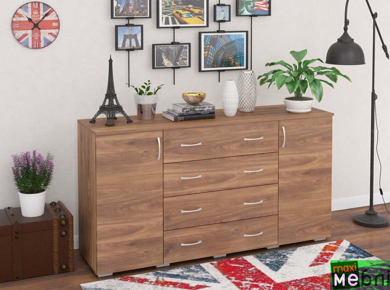 Комод є елементом спальні “Круїз” Можна докомплектувати його дзеркалом Корпус ДСП Фасад ДСП Йде у кольорі “Білий”+”Дакар” Розміри комоду 1334*811*404 Розміри дзеркала 900*800*20