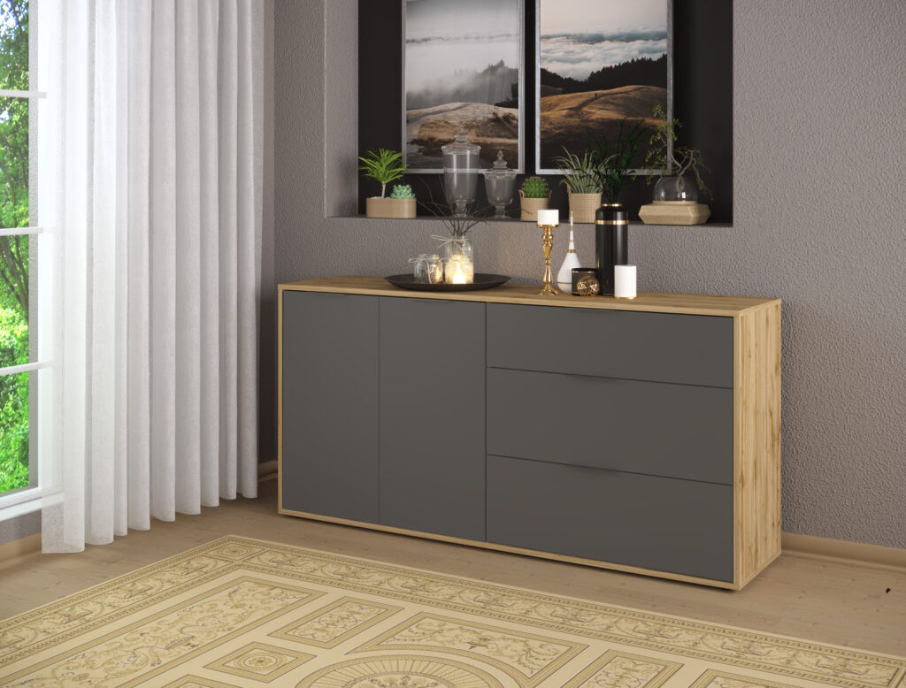 Комоди Нітро представлено у трендовому, для сучасних меблів, стилі «лофт». Вигідно підкреслена краса деревоподібної текстури яка контрастує з кольором «сірий графіт» або «білим».