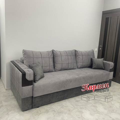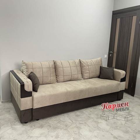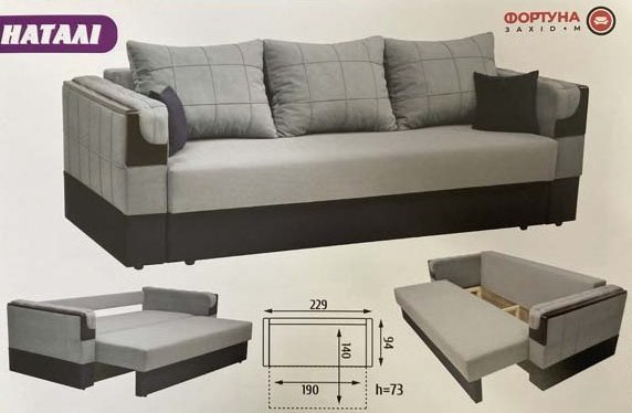 Довжина 2,10м Глибина 0,97м висота 0,75м Розміри спального місця 1,95м х 1,40м Наповнення: синтепух, поролон ST щільністю 25-40 та блочна пружина Каркас: дуб або бук (частини із великим навантаженням); сосна (решта деталей); фанера 15мм (місця кріплення механізмів); ДСП і ДВП (спинка, кришка ящика для білизни, підлокітники); картон (заокруглення та частини об’ємної форми); цвяхи, самонарізи і скоба (з’днання каркасів); шиповані з’єднання (з’єднань дерев’яних конструкцій) Механізм розкладання ? єврокнижка Дана модель розрахована для щоденного […]