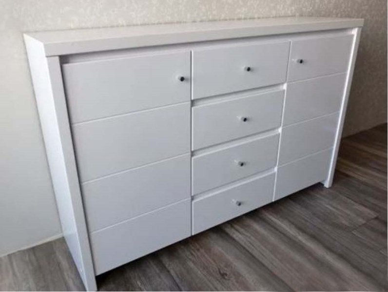Габаритні розміри Висота: 94 см. Ширина: 100 см. Глибина: 50 см. Матеріали Деталі: Каркас комода і шухляд – ламіноване ДСП, фасад шухляд та стільниця – шпон МДФ. Дно шухляди : ДВП. Направляючі механізми: телескопічні повного висуву Кольори: Венге | Горіх | Лак | Махонь | Вільха