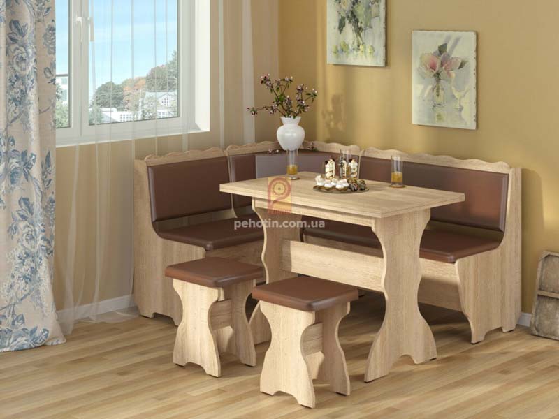 Виготовляється з масиву дуба або вільхи. Розміри 1,50х1,10 (можна збільшувати). Розміри столу 0,90х0,60 Оббивки різні