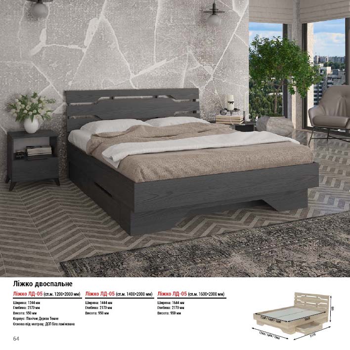 Розмір спального місця Довжина: 200 см; Ширина: 90, 120, 140, 160, 180 см Габаритні розміри: Довжина: 208,5 см Ширина: +8 см до ширини спального місця Висота стійки від голови: 69 см Висота стійки від ніг: 36,5 см Порода деревини: сосна, бук Покриття: гіпоалергенний лак італійського виробництва Основа під матрац: ортопедичні ламелі товщиною 8 мм