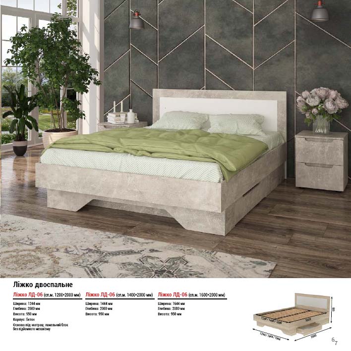 Розмір спального місця Довжина: 200 см; Ширина: 90, 120, 140, 160, 180 см Габаритні розміри: Довжина: 208,5 см Ширина: +8 см до ширини спального місця Висота стійки від голови: 69 см Висота стійки від ніг: 36,5 см Порода деревини: сосна, бук Покриття: гіпоалергенний лак італійського виробництва Основа під матрац: ортопедичні ламелі товщиною 8 мм