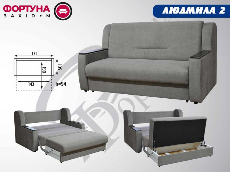 Довжина 2,10м Глибина 0,97м висота 0,75м Розміри спального місця 1,95м х 1,40м Наповнення: синтепух, поролон ST щільністю 25-40 та блочна пружина Каркас: дуб або бук (частини із великим навантаженням); сосна (решта деталей); фанера 15мм (місця кріплення механізмів); ДСП і ДВП (спинка, кришка ящика для білизни, підлокітники); картон (заокруглення та частини об’ємної форми); цвяхи, самонарізи і скоба (з’днання каркасів); шиповані з’єднання (з’єднань дерев’яних конструкцій) Механізм розкладання ? єврокнижка Дана модель розрахована для щоденного […]