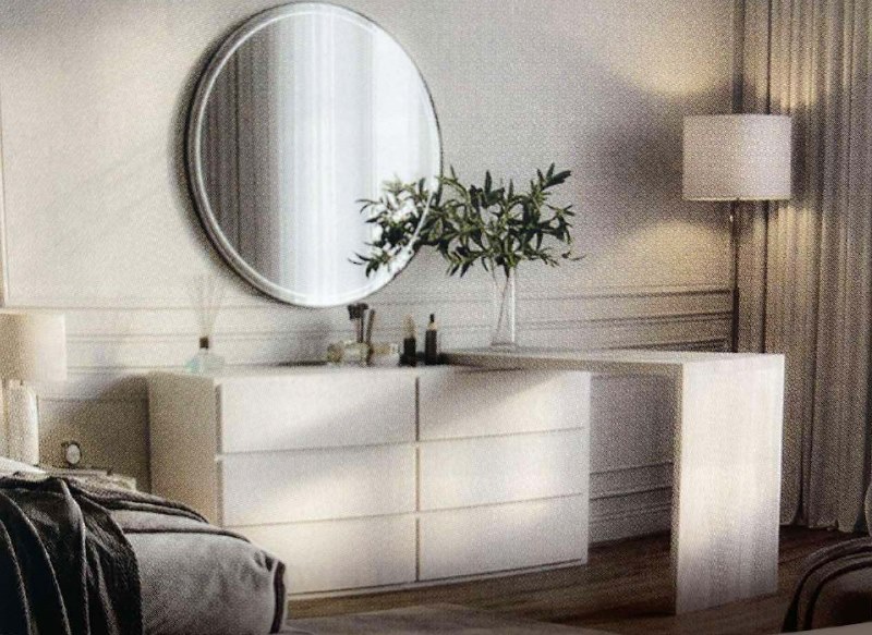 Тумба-ТВ 1630*560*520 Вітрина 1Д 740*2180*520 Стіл розсувний 2400*820*1010 Стіл не розсувний 2000*820*1010 Люстро 1510*985*75 Тумба 1685*850*505 Вітрина на тумбу 1680*1380*520 Корпус: піно (лак,ДСП). Фасади: піно (лак,ДСП), художній друк. Модель комплектується підсвіткою. Тумба обладнана висувним ящиком на направляючих повного висування.