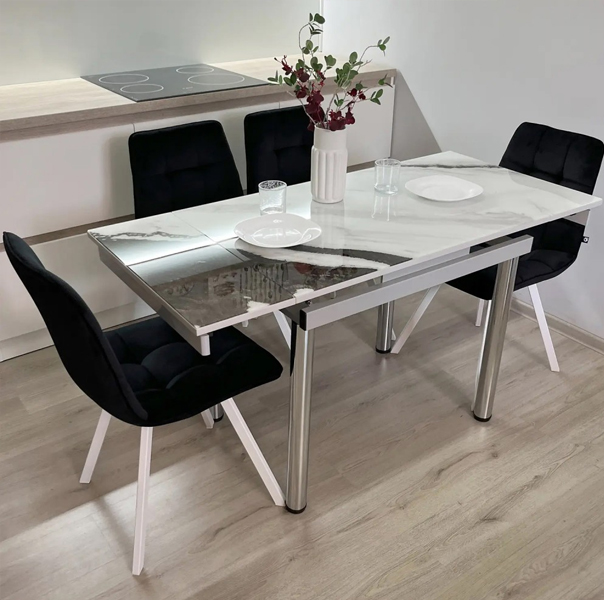 Стільниця виконана із загартованого скла. Головна його якість – здатність витримувати високі температури. Загартоване скло у 5 разів міцніше звичайного, максимально просте у догляді.