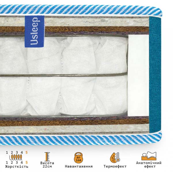 Додаткові шари наповнення моделі виготовлені з екологічно чистих матеріалів, які характеризуються різними властивостями. Особливу підтримку хребта під час сну забезпечує шар кокосової койри та матеріал Softex Linen. Це унікальне розроблення компанії Usleep, яке складається з натурального льону. Шар латексованої бавовни створює додаткову еластичність поверхні моделі. Чохол виробу виготовлений із високоміцного жакарду. Він не перешкоджає природній вентиляції матраца, а також вирізняється підвищеною практичністю.