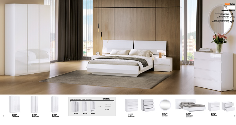 Уявіть собі ідеальну спальню — простору, світлу, наповнену відчуттям безмежного спокою… А з нашою новою колекцією MIA вам навіть не потрібно уявляти — це реальність.. Білий колір і глянцеве покриття фасадів додають цій спальні відчуття свіжості та простору, створюючи ідеальне місце для відпочинку. Кожен елемент комплекту продуманий до дрібниць . Чіткі геометричні лінії та приховані ручки підкреслюють естетику мінімалізму і забезпечують комфорт у використанні. Білий колір гармонійно поєднується з будь-яким інтер’єром та дозволить Вам створити свою ідеальну кімнату без зайвих зусиль. У комплект входить ліжко з масивним узголів’ям, кілька варіантів шаф із можливістю доукомплектування полицями, а також комод і приліжкові тумби. MIA—це ваш шлях до ідеальної спальні.