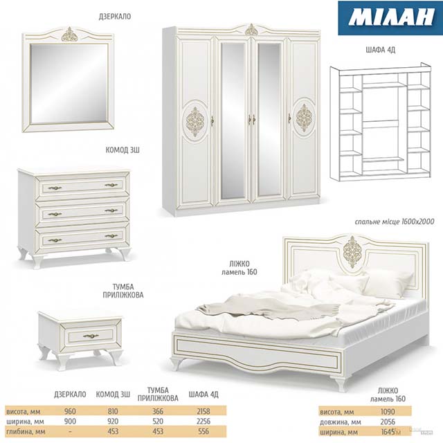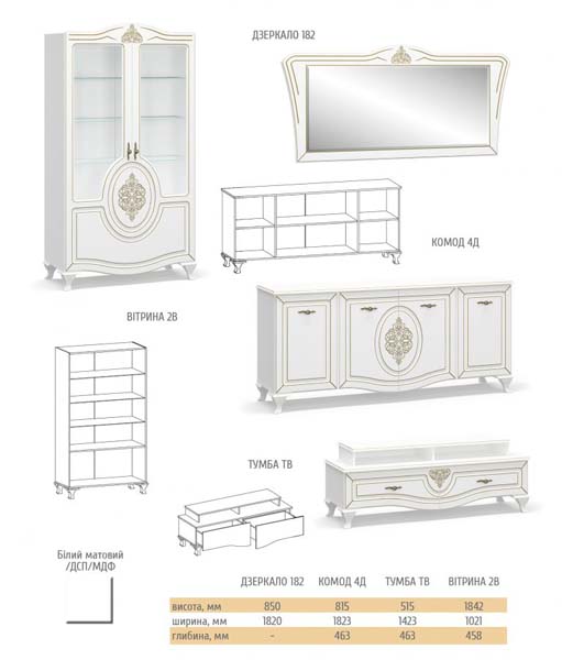 Комод є елементом спальні “Круїз” Можна докомплектувати його дзеркалом Корпус ДСП Фасад ДСП Йде у кольорі “Білий”+”Дакар” Розміри комоду 1334*811*404 Розміри дзеркала 900*800*20