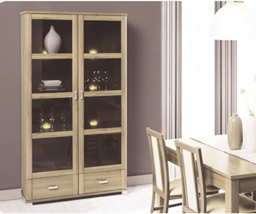 Тумба-ТВ 1630*560*520 Вітрина 1Д 740*2180*520 Стіл розсувний 2400*820*1010 Стіл не розсувний 2000*820*1010 Люстро 1510*985*75 Тумба 1685*850*505 Вітрина на тумбу 1680*1380*520 Корпус: піно (лак,ДСП). Фасади: піно (лак,ДСП), художній друк. Модель комплектується підсвіткою. Тумба обладнана висувним ящиком на направляючих повного висування.