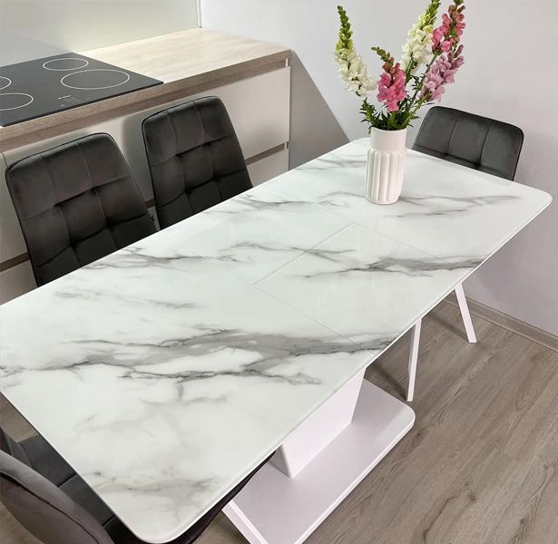 Стільниця і центральна вставка виготовлені з матового фарбованого МДФ та гартованого скла. В розкладеному вигляді ваш стіл матиме чудовий вигляд, адже відтепер зображення на вставці доповнює основний малюнок стільниці.