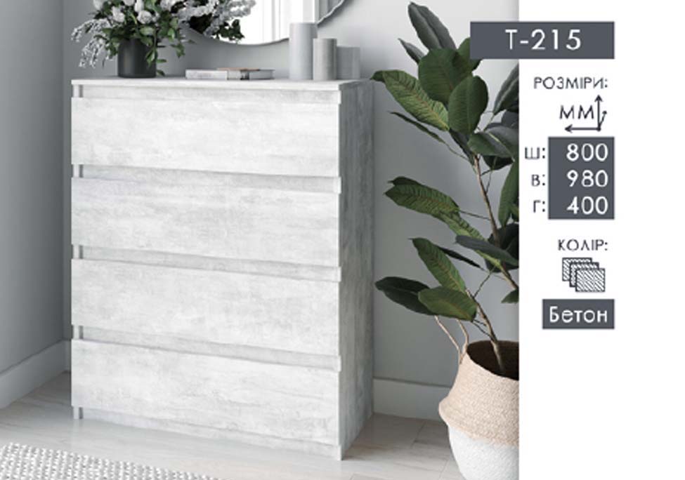 Комод є елементом спальні “Круїз” Можна докомплектувати його дзеркалом Корпус ДСП Фасад ДСП Йде у кольорі “Білий”+”Дакар” Розміри комоду 1334*811*404 Розміри дзеркала 900*800*20
