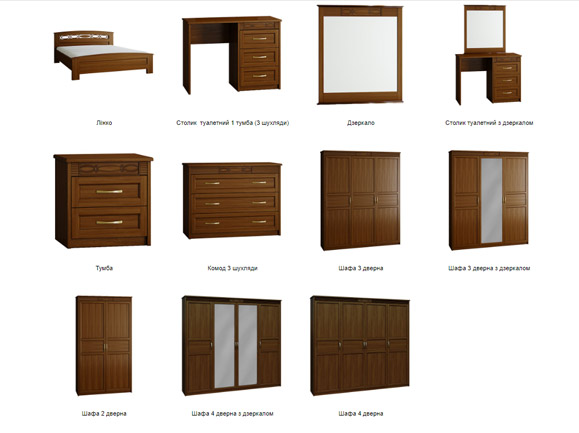 Кольори; Дуб Золотий, Горіх Італійський, Венге Шоколад, Білий Патина (патина золото, патина срібло), Прованс Патина (патина золото, патина срібло)