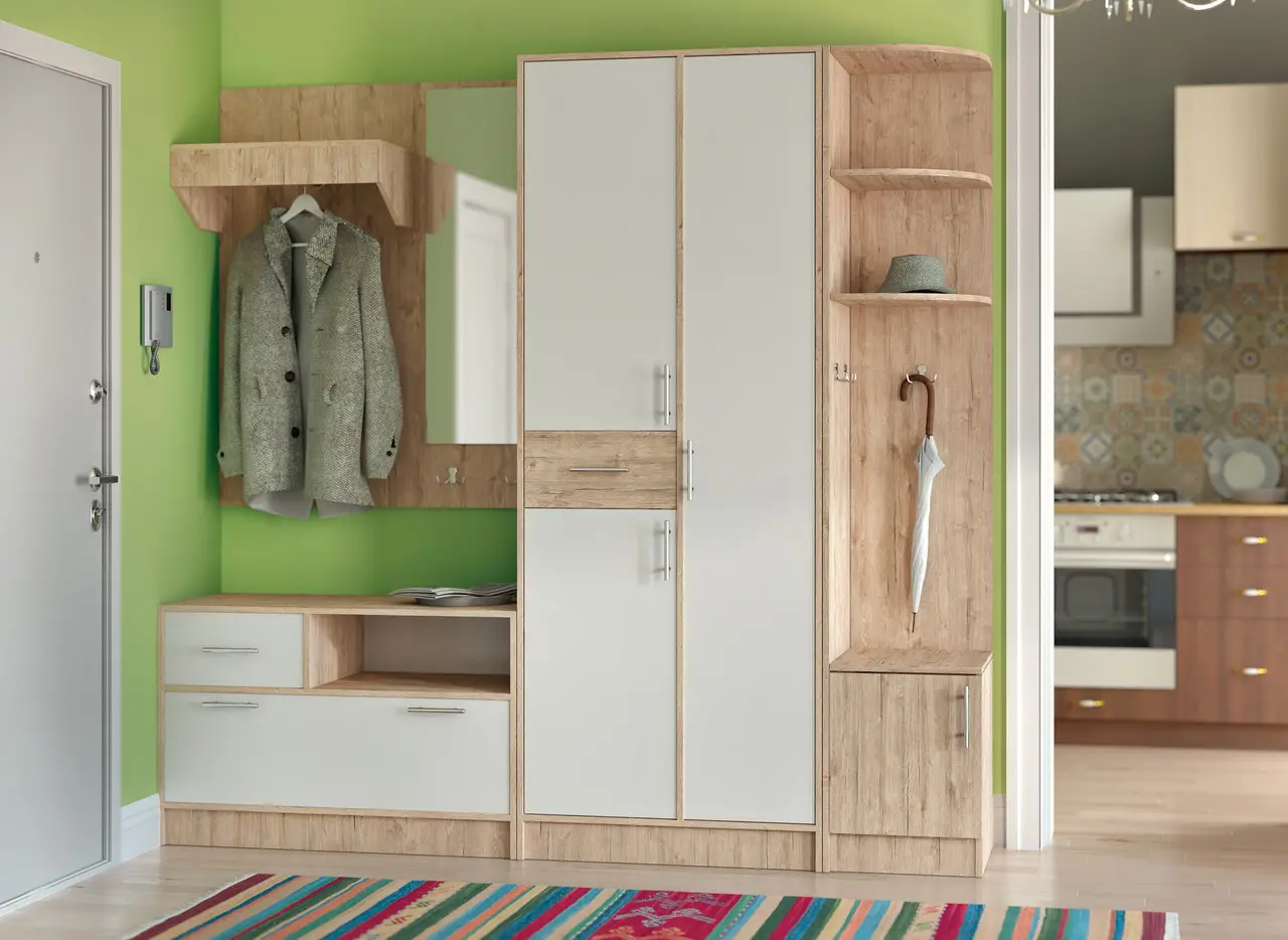 Прихожа Ширина: 1130 ммВисота: 1980 ммГлибина: 375 мм Тумба Ширина: 580 ммВисота: 1320 ммГлибина: 265 мм Корпус Дуб Сонома або Венге Темне Фасад МДФ Венге Темне або Білий